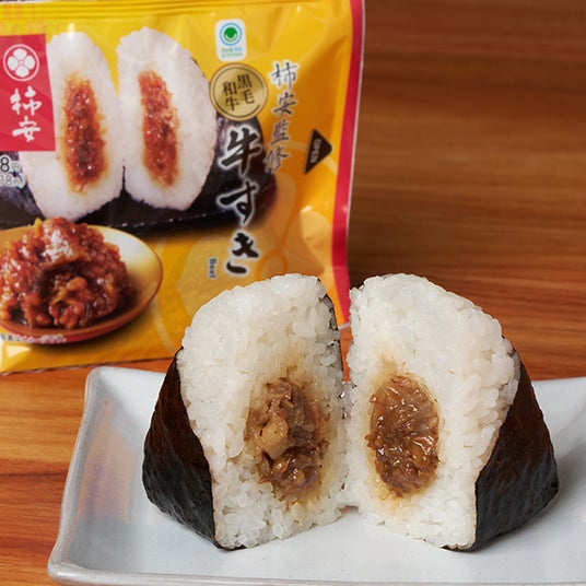 【内容】国産黒毛和牛を、肉を知り尽くした柿安が牛肉特有の美味しさを引き出すために生み出した「秘伝のタレ」を使用して味付けました。すき焼麩・玉ねぎ、ねぎエキスも一緒に炊き上げることで野菜の旨味が加わり、専門店のような深い味わいを手軽に楽しめるおむすびに仕上げています。