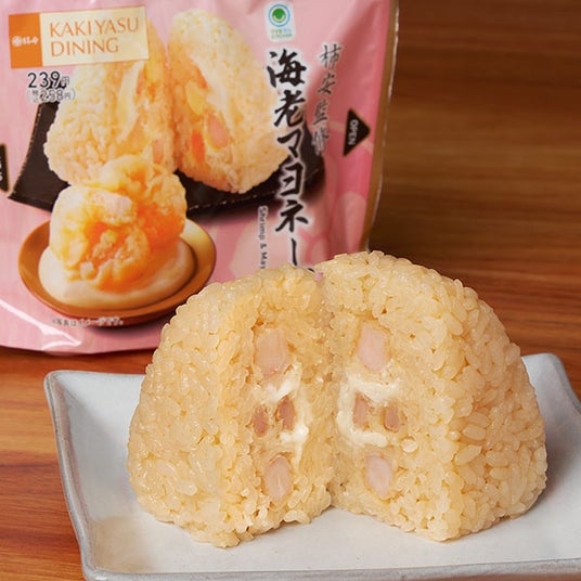 【内容】「柿安ダイニング(KAKIYASU DINING)」の看板商品「大海老マヨ」の、甘めのマヨソースと海老の味わいをイメージしたおむすびです。おむすびとして一体感を大切にするため、海老2尾は、薄く衣を付けて揚げ、コンデンスミルク・三温糖などで甘く優しい味わいのマヨソースと合わせました。甲殻類の旨み感じるピラフで包んだ、洋風な味わいのおむすびです。