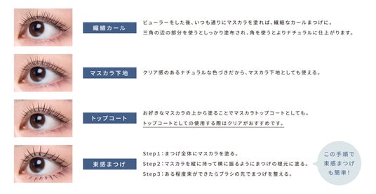 ○超極細1.2mmカットの三角ブラシ採用で目頭、目尻、下まつげの細かい毛もしっかりキャッチし、目元を際立てます。