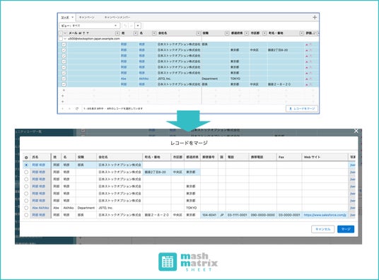 この機能により、Mashmatrix SheetのExcelライクな一覧・検索UIを活かし、重複の抽出から統合までを同一画面で完結できます。