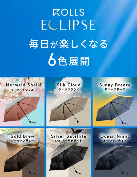 「ROLLS ECLIPSE」は、猛暑や強い日差しへの対策と、従来の折りたたみ傘に見られた使用時の不便さを解消する機能性を両立した、晴雨兼用の次世代折りたたみ傘です。遮光率・UVカット率ともに99.9%、遮熱性-19℃を実現し、熱中症リスクが高まる中での紫外線・暑さ対策として高い性能を発揮します。さらに、PETフィルムによる特殊加工と自動収納構造で操作性を向上させ、畳みにくさや収納の煩わしさ、雨によるカビの発生といった課題にも対応。ナノコーティングによる高い撥水性で使用後の水切れにも配慮しており、機能性とデザイン性を兼ね備えた本製品は、日傘使用の新たな選択肢となることを目指しています。