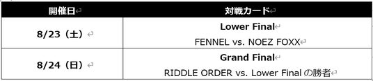プレイ中はもちろん、日常での声かけなど細部にもこだわり、限界に挑みながら、Lower Bracketからの巻き返しで頂点を目指すFENNEL――対するはメンバーの入れ替わりを経ながらもシーズンを戦い抜き、Season Finals Onlineでは対戦成績0勝というREJECT相手に大接戦の末勝利。Offline進出を決めたNOEZ FOXX。ここまで3勝 FENNEL、2勝 NOEZ FOXXとこれまで以上の接戦になること間違いなし。それぞれの課題と向き合い、成長を遂げてきた2チームが、Grand Final進出を懸けて激突します。