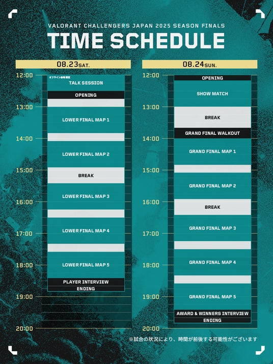 「VALORANT Challengers Japan 2025」はサーキットポイント制を導入した3 Split制で1年間の激戦を繰り広げます。Split 1は1月中旬から始まり、Kickoff Tournamentとして昨年活躍したチームとPremier E9A3を突破したチームが争います。Split 2は3月から5月にかけて行われ、オフライン会場でPlayoffの決勝戦を行います。7月のSplit 3にて全てのシーズンが幕を閉じると、8月にはいよいよSeason Finalsが開幕します。このSeason Finalsでは、これまでの3つのSplitで最もポイントを獲得したトップ4チームが激突。彼らは日本年間王者の称号、そしてVCT Ascension Pacificへの挑戦権をかけて、8月23日、24日 オフライン大会でそのすべてをぶつけます。