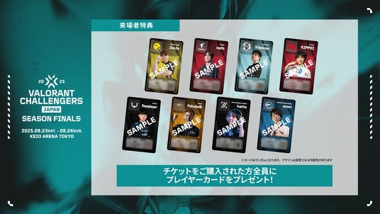 Split 2 Playoff Finalsでも大人気だったプレイヤーカードが今回も登場!「VALORANT Challengers Japan 2025 Season Finals」のチケットをご購入いただき、来場された皆様に、Split 3 Main stageに進出した8チームのオリジナルプレイヤーカードを来場者特典としてプレゼントいたします。