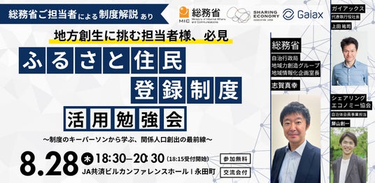 自律分散型組織「DAO」のコンサルティングおよびDAOツールを提供する株式会社ガイアックス(本社:東京都千代田区、代表執行役社長:上田 祐司、証券コード:3775、以下 ガイアックス)と一般社団法人シェアリングエコノミー協会(所在地:東京都千代田区、代表理事:上田 祐司、石山 アンジュ)と共に、総務省が発表した「ふるさと住民登録制度」の活用勉強会「「ふるさと住民登録制度」活用勉強会」(https://sharing-economy20250828.peatix.com/ )を2025年8月28日18時半より、JA共済ビル カンファレンスホールにて開催します。