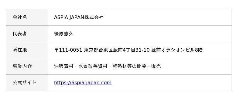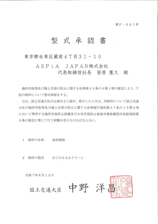 油吸着・水質改善資材の開発販売を行うASPiA JAPAN株式会社(本社:東京都台東区、代表取締役:笹原憲久)は、 油吸着材「ECOSASファイバー」と水質改善資材「ECOSASクリーン」が国土交通省の型式承認を取得したことを発表しました。 これにより、製品性能と安全性が国により公式に保証され、公共工事・官公庁・各種インフラ事業をはじめ、飲食、製造、港湾、船舶など多様な現場での導入が一層加速します。