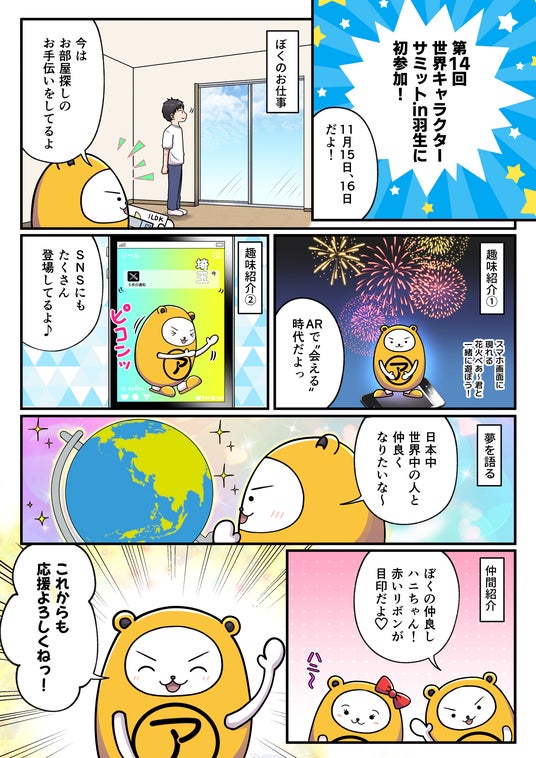 「住まいをもっと楽しく、やさしく」をテーマに、全国のアパマンショップや地域イベントで活動する当社公式キャラクター・べあ~君。今回の世界キャラクターさみっとin羽生への出展を通じて、全国のファンの皆さまと直接ふれあい、企業ブランディングの強化や地域活性化への貢献を目指してまいります。