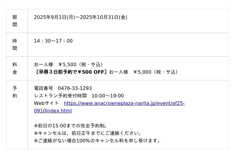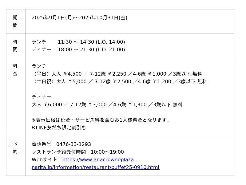 ANAクラウンプラザホテル成田(成田市堀之内 総支配人 ダヴィデ・ザナルディ)では、9月1日(月)から10月31日(金)の2か月間限定で「フレンチビストロビュッフェ」と「ハロウィンアフタヌーンティー」を 1F レストランカフェ「セレース」にて開催いたします。