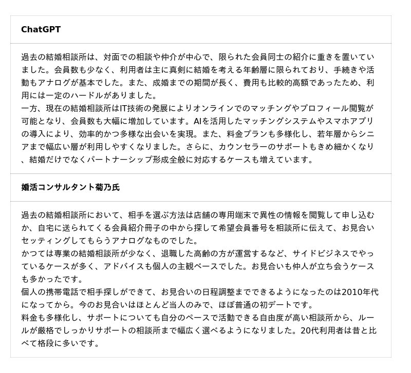 こうした状況を踏まえ、「結婚相談所の価値」を多角的に分析するため、このたび、生成AIとして広がりを見せるChatGPTと婚活コンサルタント菊乃氏という異なる視点から「結婚相談所の価値」について比較しまとめました。時代が変わっても成婚にこだわる「パートナーエージェント」の姿勢と、進化する結婚相談所の今をぜひご覧ください。
