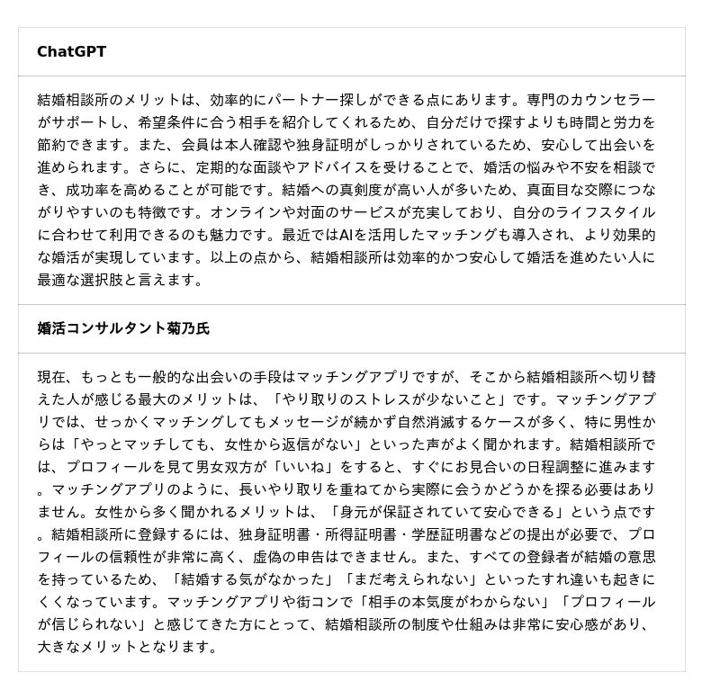 今回、ChatGPTと婚活コンサルタント菊乃氏の回答を比較することで、ChatGPTの網羅的・客観的な分析と、菊乃氏の現場経験に基づく実体験や利用者の声を組み合わせた結婚相談所の価値を確認することができました。「パートナーエージェント」は、これからも時代とともに進化し、最適な出会いを創造してまいります。