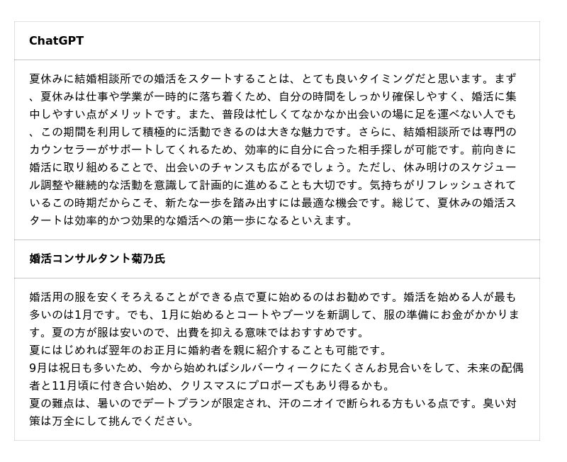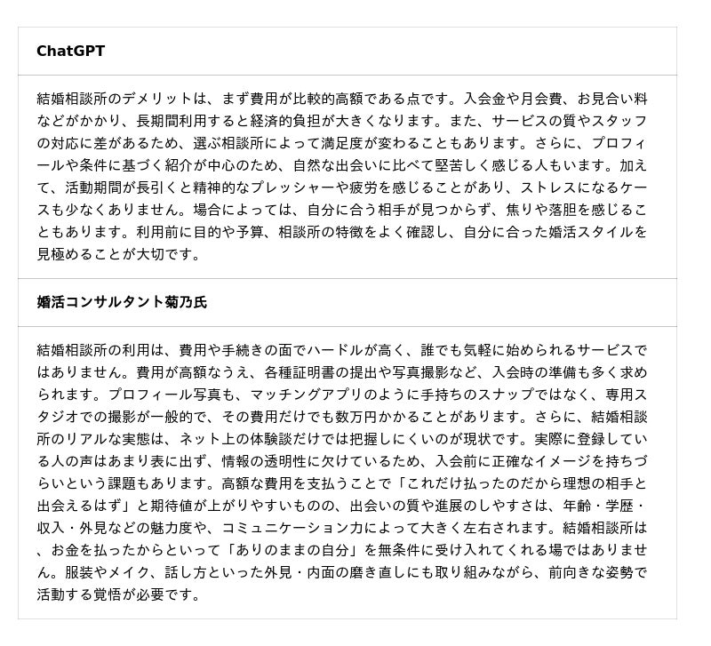 ChatGPTは全体を幅広くカバーするのに対し、菊乃氏はより詳細かつ現実的な分析を行っています。
