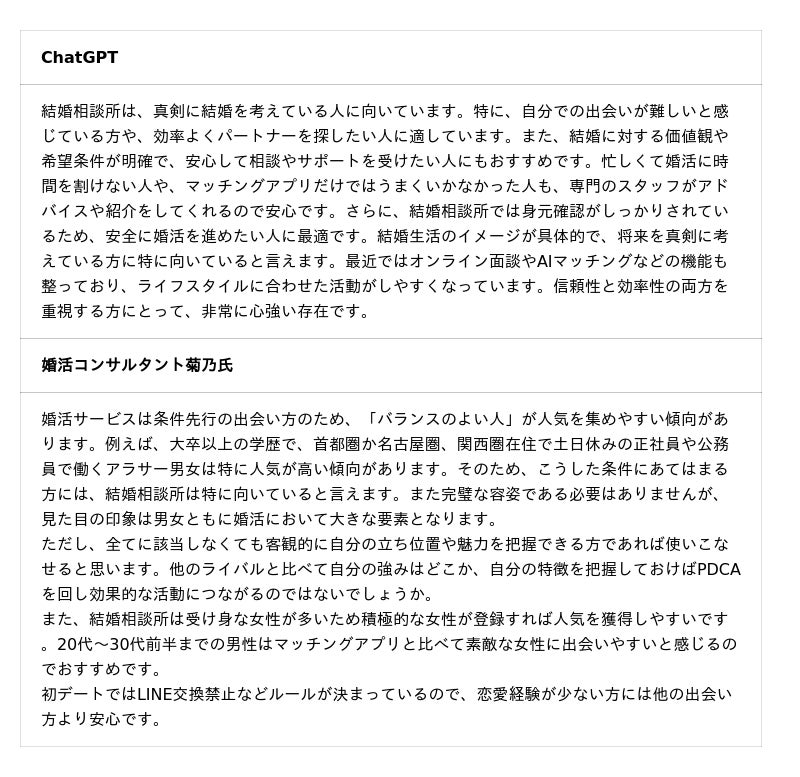 ・真剣に結婚を考えている人で、自分での出会いが難しい、効率よく探したい人、安全に婚活を始めたい人に向いており、信頼性、効率を強調(ChatGPTのみ)