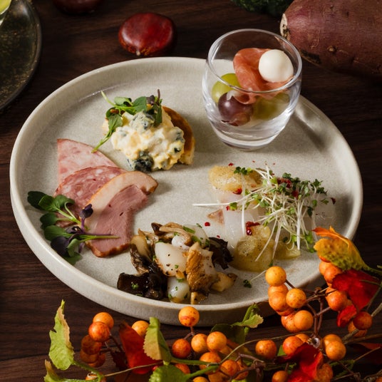 (乾杯酒)季節のスパークリングワインカクテル又は 季節のスパークリングワインのモクテル、アシェットディゼール(キャラメルマロンムース)(注1)、アフタヌーンティー(注2)、国産牛フィレ肉のタリアータ、パスタ(ボロネーゼ/キノコクリーム/ハーフラザニアより1品)