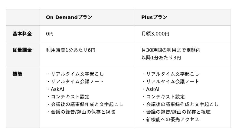 - 機能の継続的な拡充:ユーザーの皆様からフィードバックをいただきつつ、リアルタイム会議支援機能の強化、会議後のタスク自動化などを順次提供していきます。なおPlusプランでは、新機能への優先アクセスをご用意しており、最先端の体験をいち早くご利用いただけます。
