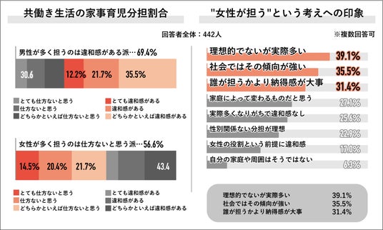 回答者全体の442人に共働き生活における家事育児の分担割合への思い聞くと、"男性"が多く担うのは「違和感がある派」が69.4%で過半数を占め、"女性"が多く担うのは「仕方ないと思う派」が56.6%で過半数を占めました。また、”共働き生活で家事や育児は女性が多く担う”という考えへの印象を聞くと、「理想的でないが実際多い」が39.1%で最多となり、次いで「社会ではその傾向が強い」が35.5%、「誰が担うかより納得感が大事」が31.4%となりました。