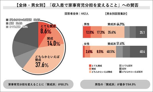 回答者全体の442人に、“収入差で共働き生活の家事育児分担を変えること”への賛否を聞くと、「賛成派」が60.2%と過半数を占め、内訳は「とても賛成」が8.6%、「賛成」が14.0%、「どちらかといえば賛成」が37.6%となりました。「賛成派」の男女別では、男性が64.9%、女性が51.6%と、男女で賛否が分かれました。