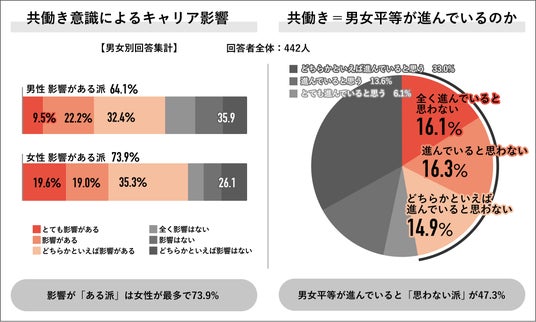 「キャリア選択に影響がある派」の男女別では、男性が64.1%、女性が73.9%となり、男女間でギャップが見られました。回答者全体の442人に、共働き=男女平等が進んでいるのかを聞くと、「進んでいると思わない派」が47.3%となり、内訳は「全く進んでいると思わない」が16.1%、「進んでいると思わない」が16.3%、「どちらかといえば進んでいると思わない」が14.9%となりました。
