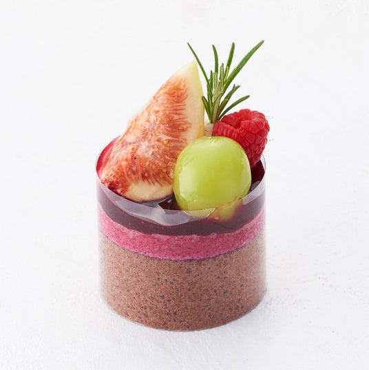 甘酸っぱいカシスムースと、ホワイトチョコムースをショコラアーモンドスポンジで包み、カシスグラサージュと旬の果実でつややかに仕上げました。