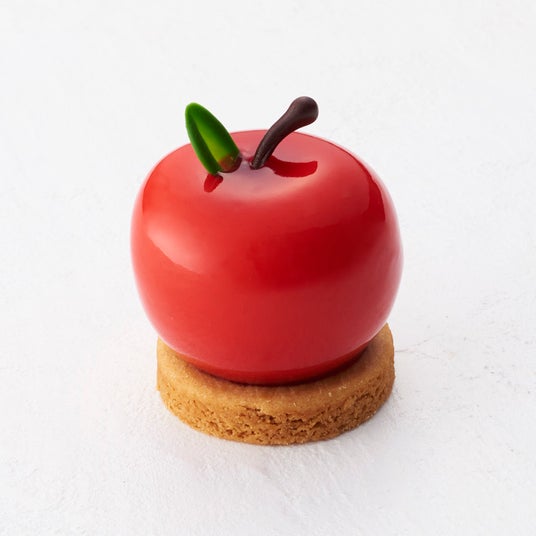 紅玉りんごのムースでアールグレイとショコラのムース、フランボワーズソースをとじ込めた真っ赤に実った林檎のケーキ。