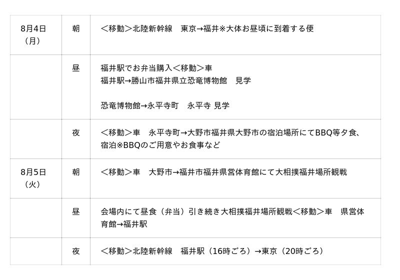 夏休み中の旅行が家庭の事情で難しい子どもたちに、貴重な体験と忘れられない思い出をプレゼントするのが目的。ツアーは北陸新幹線での移動から始まり、恐竜博物館や永平寺を訪れ、さらに大相撲の迫力を間近で楽しむ、充実した2日間となった。