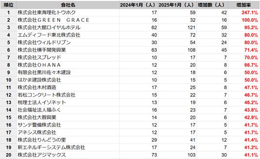 (※増加率=(2025年従業員数 - 2024年従業員数) ÷ 2024年従業員数 × 100)