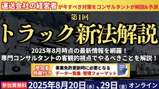 日本最大級の物流コンサルティングファーム 船井総研ロジ株式会社(本社:東京都中央区、代表:橋本直行、以下「船井総研ロジ」)は、2025年8月29日(金)に運送会社の経営者・経営幹部の方を対象にした「【第1回】トラック新法解説セミナー」をオンラインで開催いたします。