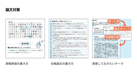 論文対策では、原稿用紙の書き方や論文を作成する上での鉄則、合格論文の実例、用意しておきたいテーマなども紹介。