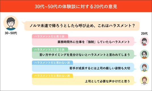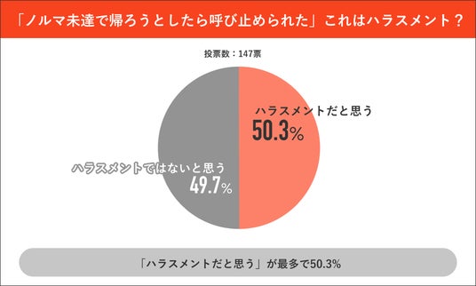 30代以降が体験した「帰宅しようとしたらノルマをクリアしてないのに帰るのか、と上司に怒られた」エピソードが、ハラスメントに該当するかについて20代の意見を聞くと、「ハラスメントだと思う派」は50.3%、「ハラスメントだと思わない派」が49.7%と意見が割れる結果となり、20代が考えるハラスメントの境界線について多くのコメントが集まりました。