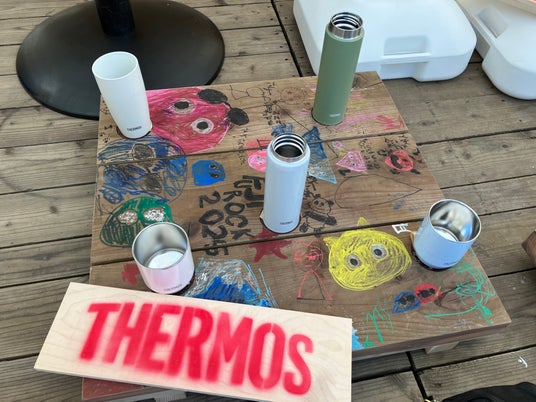 サーモスブースでは、来場者ならどなたでも参加できるチャリティーキャンペーンとして輪投げコーナーを設置。フジロックの森プロジェクトの活動の廃材を土台として加工・ペイントし、サーモス本社にて回収した使用済魔法びんを設置した輪投げチャレンジには400名を超える方々が参加し、大いに賑わいました。景品としてサーモス製品のほか、会場内対象飲食店舗でマイボトルを提示して利用できる「マイボトル・マイタンブラー割引チケット」を参加賞として贈呈しました。なお、参加費の一部は「フジロックの森」プロジェクトへ寄付します。