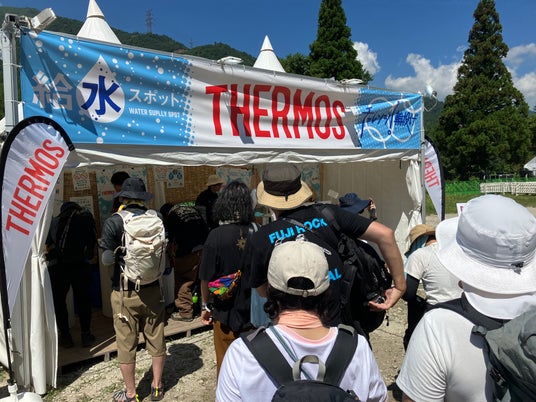 魔法びんのグローバル企業として、人と社会に快適で環境にもやさしいライフスタイルを提案するサーモス 株式会社(本社:東京都港区 社長:片岡 有二)は、2025年7月25日(金)~27日(日)にかけて新潟県湯沢町苗場スキー場で開催されたロック・フェスティバル「FUJI ROCK FESTIVAL‘25」に協賛しました。会場内にサーモスブースを出店し、マイボトル持参者が無料で利用できる「給水スポット」を設置。フジロック開催3日間で約1,550リットル(1名あたり500mlと換算した場合、延べ約3,000名)の水を提供しました。さらに、参加費の一部を「フジロックの森」に寄付するチャリティーキャンペーンとして、来場者参加型の輪投げコーナーを実施し、多くの来場者で賑わいました。