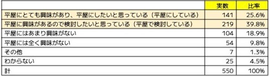 今回の調査では、事前調査として「現在の住まいから、最近一戸建てにした方」や「一戸建てを考えている方」を抽出し、本調査としてその方々へ平屋への興味や魅力のポイントを質問しました。