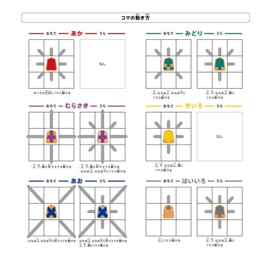 ■難しいコマの動きをデザインで学べる積み木やブロックおもちゃをイメージしたカラーリングを施したコマは、動きの特徴をとらえており、すぐに覚えて遊べます。