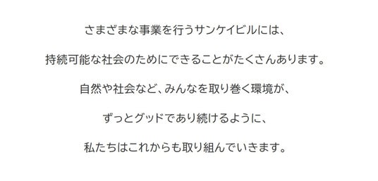 株式会社サンケイビル(本社:東京都千代田区大手町、代表取締役社長:飯島一暢、以下「当社」という)は、当社のサステナビリティ活動をわかりやすく伝えることと、閲覧いただく方のユーザビリティ向上を目指し、この度当社の公式ホームページで、サステナビリティのページ( URL: https://www.sankeibldg.co.jp/sustainability/)をリニューアルしましたので、お知らせいたします。