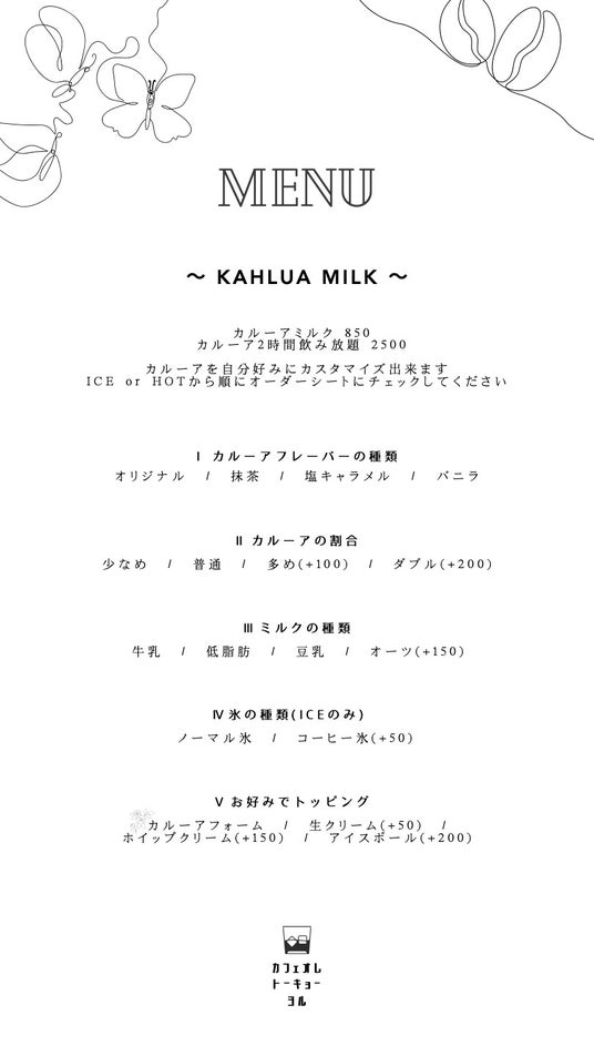 当店では、一般的なカルーアミルクだけではなく、抹茶やバニラ、キャラメルなどのフレーバーを選ぶことができます。また、牛乳、低脂肪乳、豆乳、オーツミルクなどミルクの種類や、カルーアの濃さなどを調節したり、カルーアフォームやアイスクリームなどのトッピングをしたり、自分好みにカスタマイズすることができます。