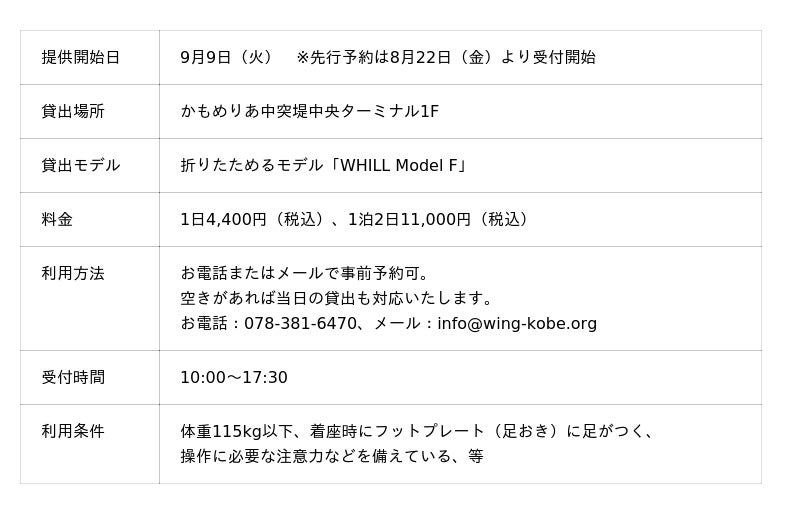 神戸UTCでは元町・神戸ハーバーランド周辺の複数スポットで手動の車いすの貸し出しに加え、神戸のユニバーサルな情報紙の発行や、宿泊・観光・移動・介助など旅に関する相談窓口も運営しています。ウィルについても今後、WHILL社との連携を深めながら、あらゆる人がどこでも安心快適に近距離移動できるよう、網羅的でインクルーシブなアクセシビリティ環境の整備拡充を進めてまいります。