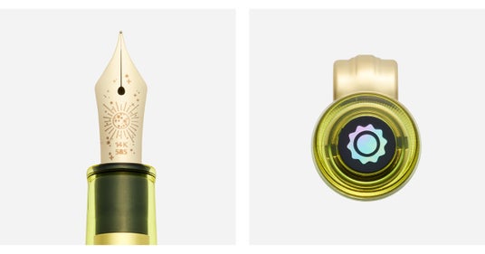 滑らかな書き味をもたらす14金のペン先には、自ら光を放つ太陽をモチーフにした装飾を施し、黒点を思わせる黒い蓋栓飾りにはレインボー箔の太陽をあしらいました。