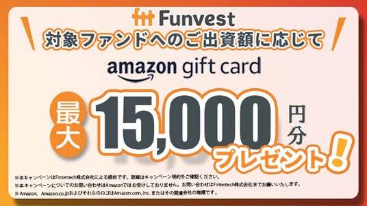 本ファンドへ出資していただいた投資家の皆様を対象として、出資額に応じて最大15,000円分のAmazonギフトカードをプレゼントするキャンペーンも併せて実施いたします。