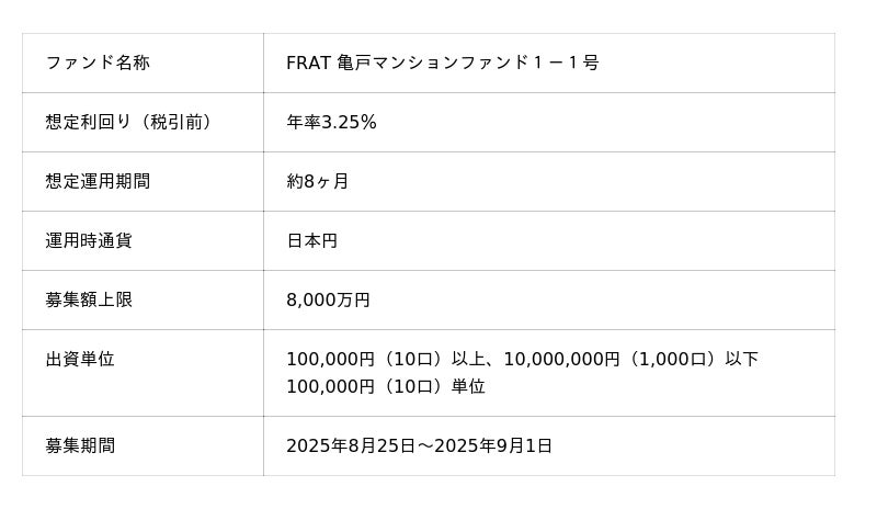 「未来をわかちあう投資」を提供する「Funvest(ファンベスト)」(以下、Funvest)は、「FRAT 亀戸マンションファンド1-1号」(以下、本ファンド)の募集を8/25より開始しますので、お知らせいたします。