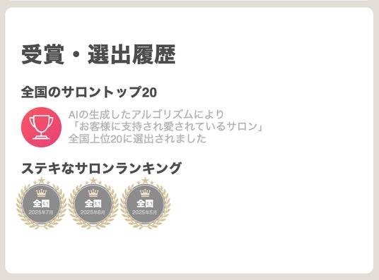 本全国のサロントップ20は、実際に来店されたお客様からの評価や支持をもとに選定されるものであり、日々のサービス品質やスタッフの技術、そしてお客様からの信頼が高く評価された結果となります。