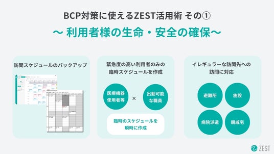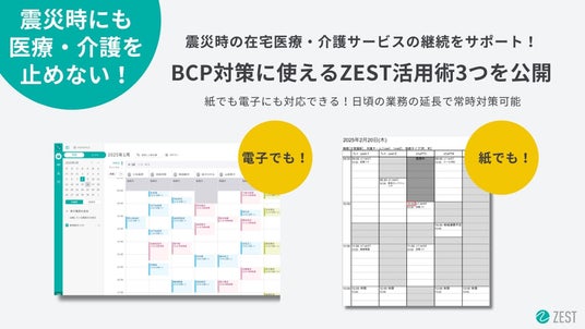 在宅医療・介護の収益改善プラットフォーム「ZEST」を展開する株式会社ゼスト(本社:東京都新宿区、代表取締役社長:一色淳之介)は、在宅医療・介護事業者様向けに、BCP対策にお使いいただけるZEST活用術を公開したことをお知らせいたします。