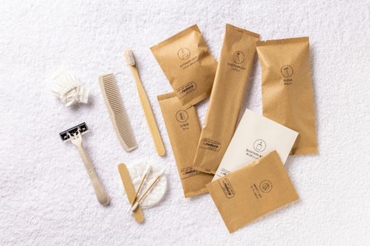 客室のアメニティ(竹などの代替素材製、紙のパッケージのものを使用)