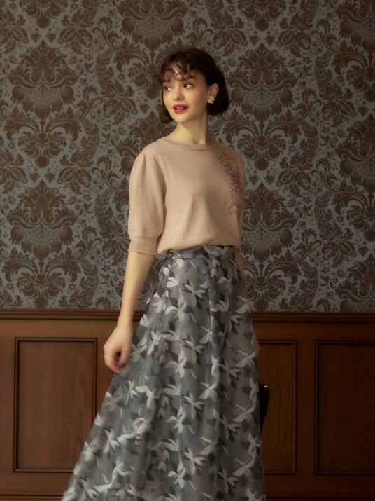 今初秋のクチュールブローチはオーガンジー素材のリボンで作られた花柄の刺繍が特徴のニットトップスや、リンドウの花の刺繍が映える存在感のあるフレアスカート、ふわりと広がるシフォン生地が魅力の大人可愛いワンピースなど、秋のムードが漂うアイテムをバリエーション豊かに展開いたします。