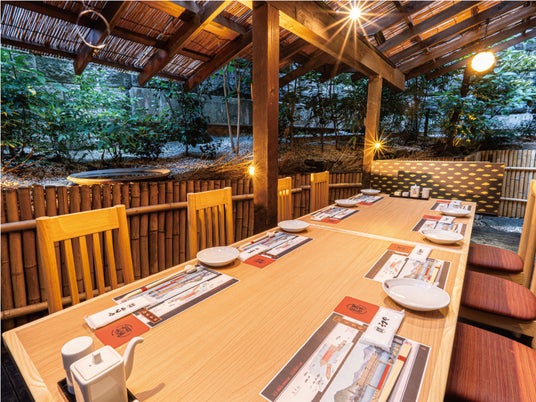 落ち着いた灯りと緑に包まれたテラス席は、2名様でのご利用にも最適。仕事帰りのひとときや、特別な方との大切な時間をお過ごしください。