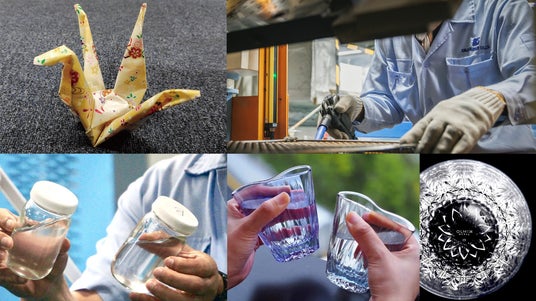 画像の説明:和紙とシリコーンゴムを一体化させた「和紙リコーン」イメージ写真や製造風景、シリコーンゴムを用いたオリジナルブランドKINJO JAPANのグラスなど