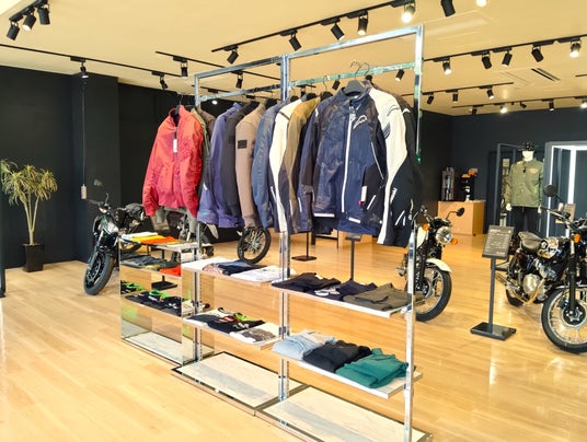 木目調のフロアと白い天井が織りなす明るい店内。モーターサイクルとプラザアパレルがゆったりと展示され、どなたでも楽しめる空間となっています。