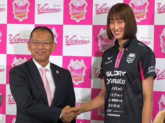 記者会見でヴィクトリーナ姫路代表取締役社長・上原光徳氏と握手する秋本選手