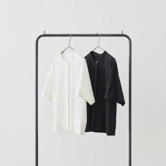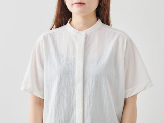 きちんとボタンを留めて一枚で着れば、品よく涼しげなブラウスとして。