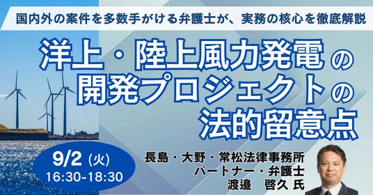 本セミナーでは、国内外の風力発電プロジェクトに多数携わってきた講師が、陸上風力と洋上風力に関する最新の法務の状況を概説します。国内で陸上風力・洋上風力プロジェクトを推進するに際し、事業者の観点で特に留意すべき許認可の観点、契約実務、制度的ポイントを、裁判例や近時の実務的論点も交えつつ、法務の観点から概説いたします。〔講義項目〕