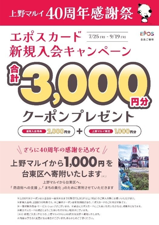期間中、上野マルイでエポスカード新規ご入会いただいた方に通常特典の2,000円分クーポンに上野マルイ限定1,000円分を加えた、合計3,000円分のクーポンをプレゼントいたします。