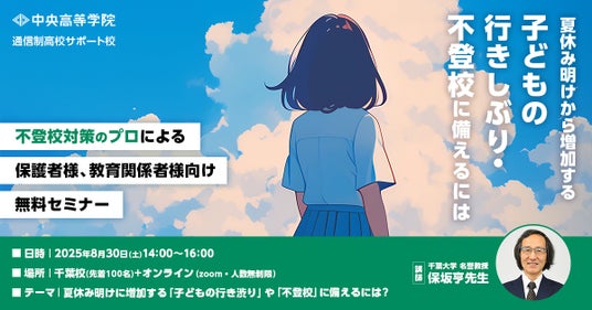 本セミナーでは、千葉大学名誉教授・教育心理学者の保坂亨先生による講演をはじめ、不登校を経験した現役高校生・大学生による体験談、さらに中央高等学院独自の「中学校学級化プログラム」の紹介など、多角的な視点から不登校支援を考えます。会場参加は先着100名、またZoomによるオンライン配信も行います。